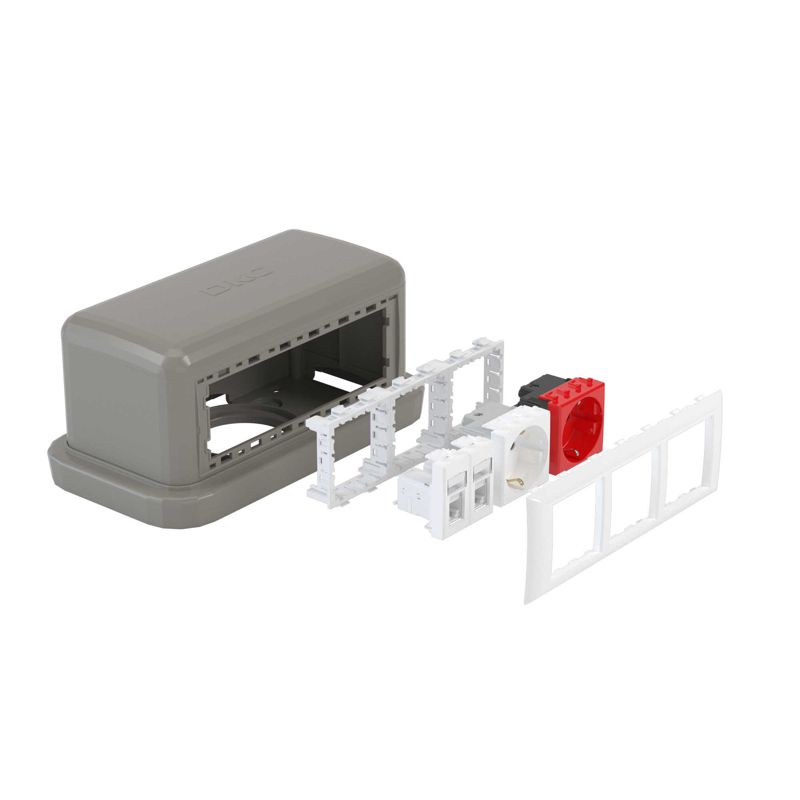 Ключевые преимущества включают двустороннюю компоновку на 6 модулей с каждой стороны, что удваивает полезность при компактных размерах. В комплект уже входят основание, стойка, крышка, рамки и заглушка, что ускоряет установку. Прочное пластиковое исполнение в серой цветовой гамме легко вписывается в современный дизайн, а боковой кабельный ввод обеспечивает удобную подводку проводов.