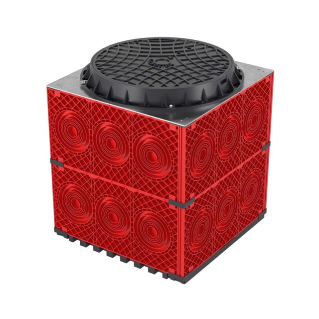 Колодец изготовлен из прочного пластика, а цветовое решение (красные стенки, черные элементы) обеспечивает высокую заметность и эстетичность. Габаритные размеры 750x750x750 мм делают его оптимальным для стандартных задач.