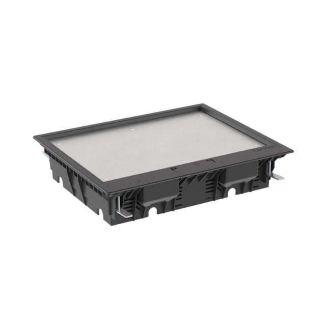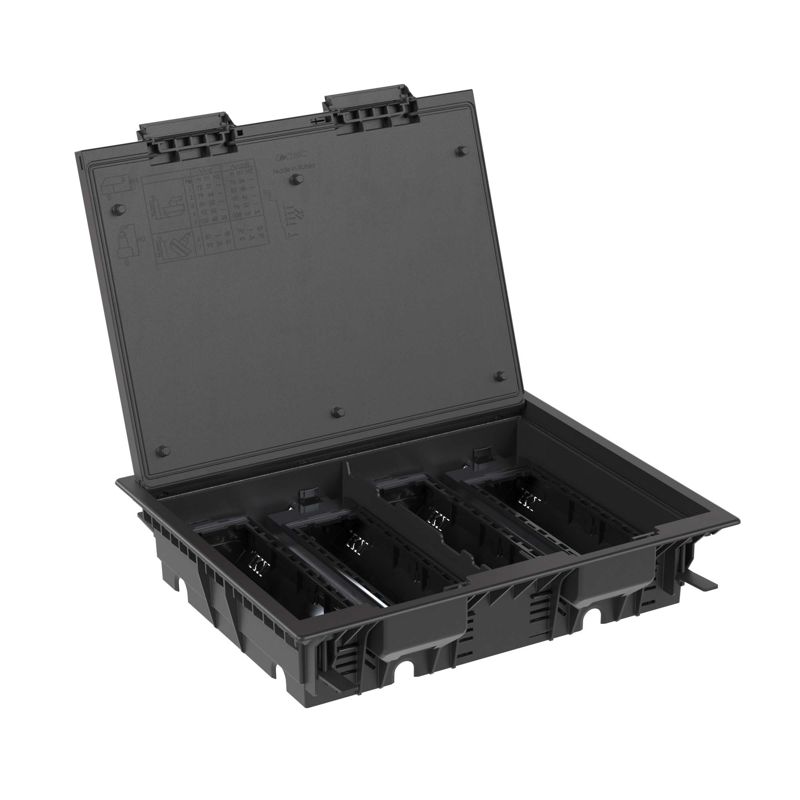 В комплект поставки входят все необходимые элементы для монтажа: основание лючка, четыре комплекта основания и дна подрозеточного блока, а также крепеж. Элегантный черный цвет (RAL 9005) делает модель универсальной для различных интерьерных решений.