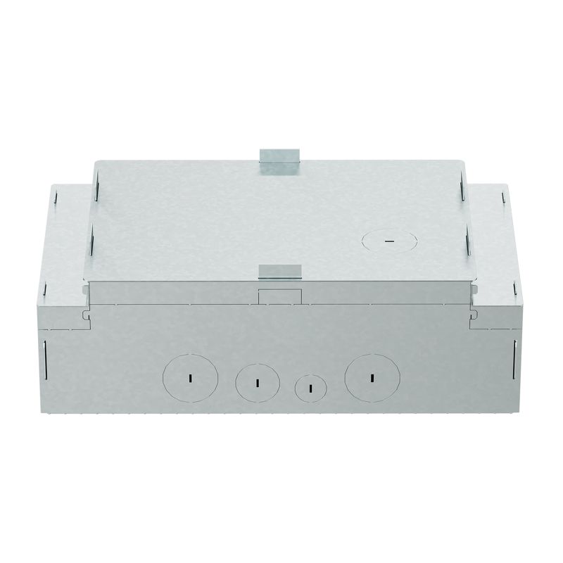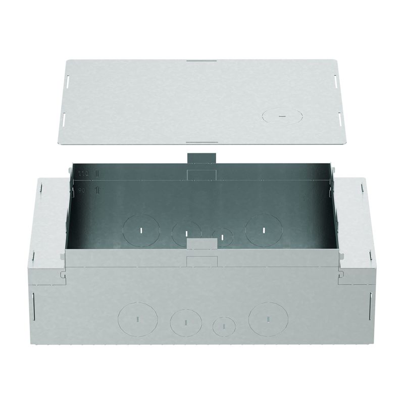 Опалубка используется для создания ниши под установку встроенного лючка на 12 модулей. Конструкция рассчитана на заливку бетонной стяжкой, что позволяет идеально интегрировать точку подключения в чистый пол. Боковые стенки с перфорацией обеспечивают удобный подвод кабельных трасс различных диаметров с четырех сторон.