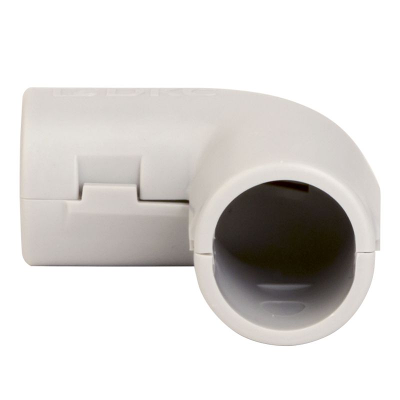 Ключевое преимущество модели — разъемная конструкция, которая позволяет устанавливать поворот на уже смонтированные участки труб без их демонтажа, что значительно экономит время и упрощает обслуживание. Корпус из полипропилена обеспечивает стойкость к ударным нагрузкам и долговечность, а степень защиты IP40 гарантирует базовую защиту от пыли и влаги.