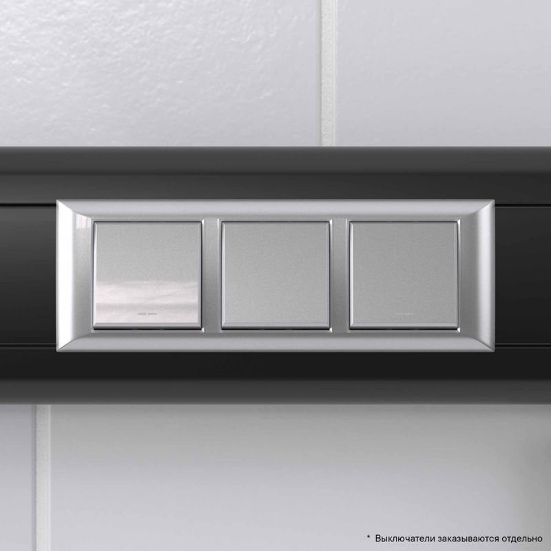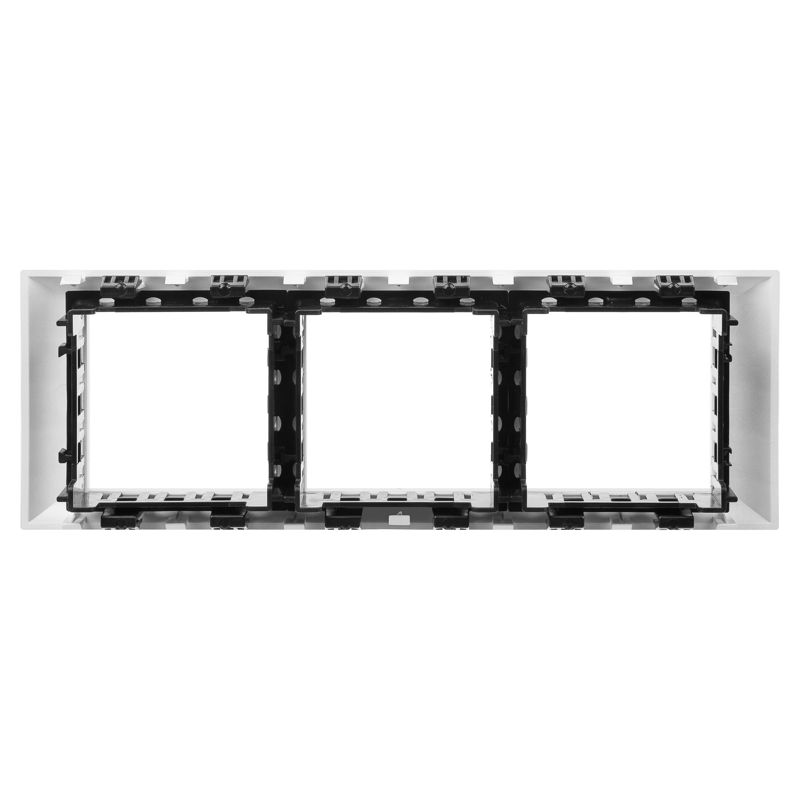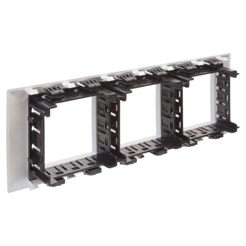 Рамка совместима с каркасами 4402812 (входят в комплект) и рассчитана на 6 модулей, что позволяет разместить до 3-х двойных розеток или комбинацию различных устройств. Ее габариты (длина 183.9 мм) оптимизированы для монтажа в стандартные кабель-каналы.