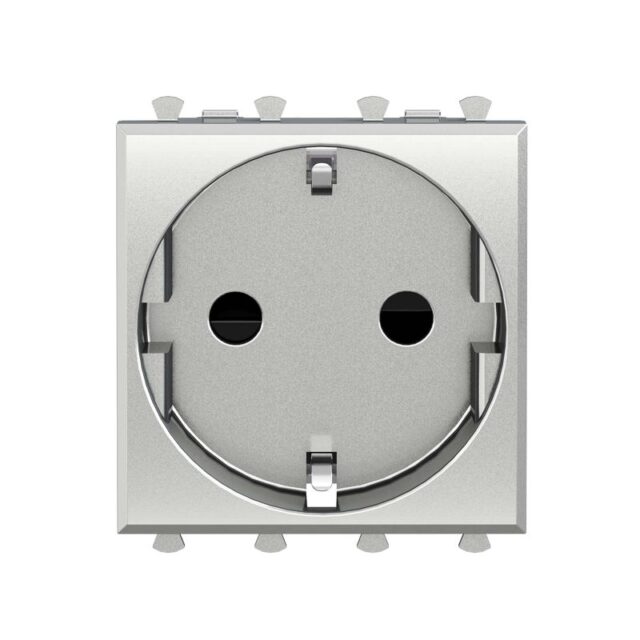 Розетка занимает 2 модуля в системе и поставляется в элегантном сером цвете с блестящей декоративной поверхностью. Конструкция предусматривает возможность установки ориентационного освещения, что добавляет удобства в условиях слабой освещенности.